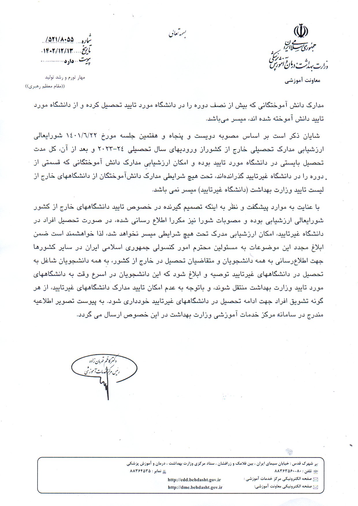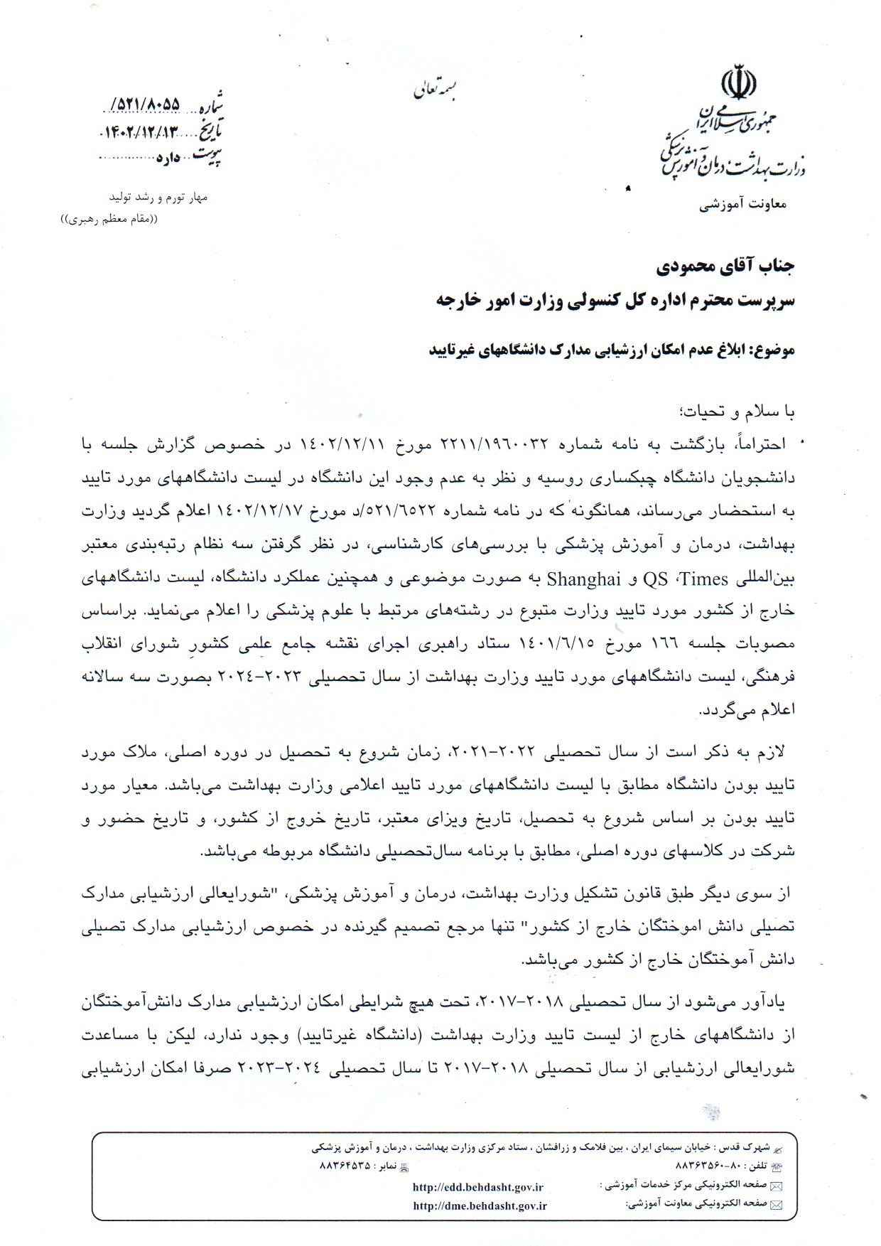از سال تحصیلی 2021-2022 ، زمان شروع به تحصیل در دوره اصلی ، ملاک مورد تائید بودن دانشگاه مطابق با لیست مورد تائید اعلامی وزارت بهداشت میباشد. معیار شروع به تحصیل ، تاریخ ویزای معتبر و تاریخ خروج از کشور و شرکت در کلاس های دوره اصلی دانشگاه مربوطه میباشد. علاوه بر این جهت برخورداری از هرگونه خدمات قابل ارائه توسط وزارت بهداشت، درمان و آموزش پزشکی باید در هنگام ارائه درخواست علاوه بر مستندات ، مدارک دال بر تسلط لازم به زبان خارجی کشور محل تحصیل توسط دانشجویان ارائه گردد.